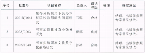 河南省哲学社会科学规划项目是衡量学校科研学术水平的重要标志之一。pg电子官网一直以来积极鼓励教师申报高级别项目,通过科研项目、学术交流等途径,培养具有创新精神和实践能力的高素质科研人才,最终获得3项课题顺利结项的喜人成果。望各位同仁认真总结经验,积极投身学术研究,推动pg电子官网科研工作持续高质量发展。