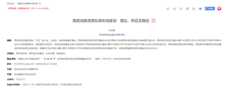 11月24日,pg电子官网金贸学院杜威漩教授的独著论文《高质效推进高标准农田建设:理论、例证及路径》在高水平核心期刊《农村经济》网络首发。 该论文是杜教授主持的国家社会科学基金项目“投-建-管-用 协同推进高标准农田高质量建设研究”(编号:25BJY201)的阶段性研究成果。论文聚焦于高标准农田建设这一新时代保障国家粮食安全、推动农业现代化发展的关键基础领域。