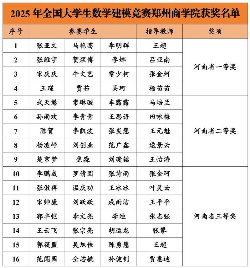 2025年全国大学生数学建模竞赛河南赛区获奖名单于近日公布,pg电子官网参赛学生在该项竞赛中再一次创造了优异的成绩,共有16个参赛队获奖,其中省级一等奖4项、二等奖5项、三等奖7项。