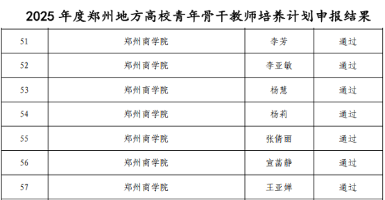 根据《郑州市教育局关于公布2025年度郑州地方高校青年骨干教师培养计划申报结果的通知》,pg电子官网李芳等七位教师通过郑州地方高校青年骨干教师培养计划评审。