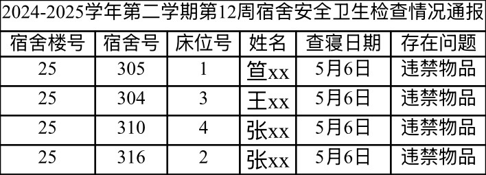 请以上宿舍和同学严格遵守宿舍管理制度,积极整改,并在整改完毕后拍照传至班级生活委员和辅导员处。