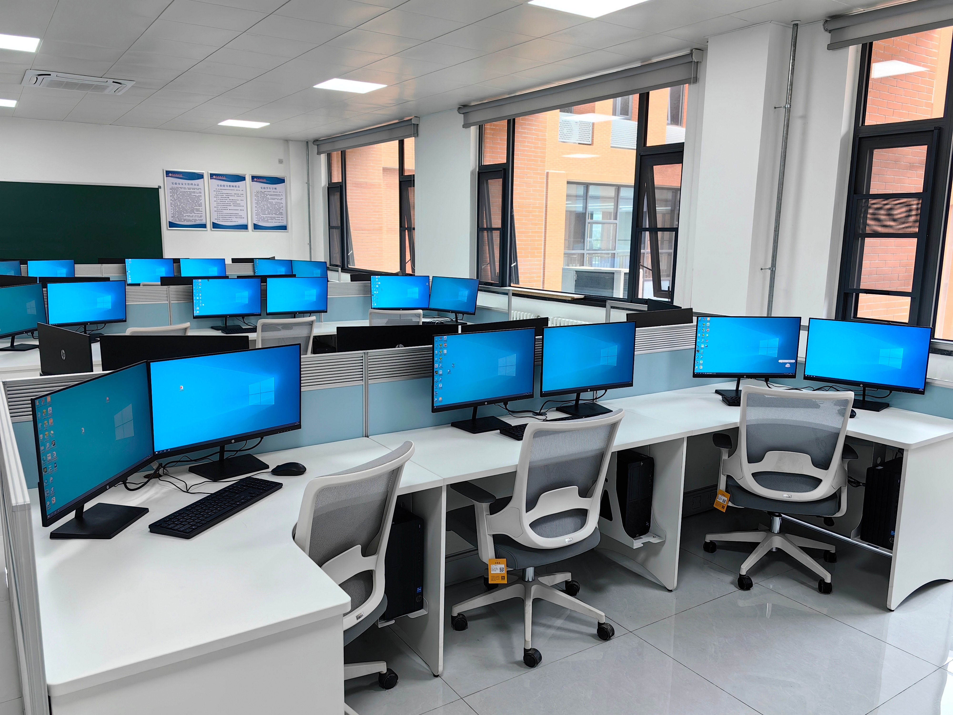 数智设计实验室(一)核心设备包括65台高性能计算机,在软件生态上,本实验室构建了从基础办公到专业领域的完整应用体系。不仅预装了WPS Office等办公软件和C语言编程环境,更全面部署了工程设计领域的核心工具,如Auto CAD、Autodesk Revit、广联达系列(云计价、土建计量)、Navisworks、斑马进度,以及结构分析软件PKPM、YJK和桥梁博士等,同时支持Visual Studio进行程序开发。能够充分满足计算机基础、软件开发、建筑工程、工程造价、结构设计等多学科的教学与实践需求,是培养学生综合信息素养与专业实操能力的重要基地。