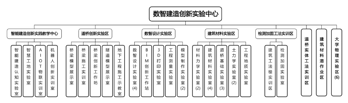 中心规划总建筑面积逾6500㎡,整体采用七区一心规划格局,构建起“核心实践阵地+专业基础实验室+工法展示区”三维架构,实现“学、练、展”一体化实践环境。目前,四大核心区已建设完成,27间高水平数智化实验室顺利投入本科教学使用,覆盖日常实验、课程实训等核心教学场景。