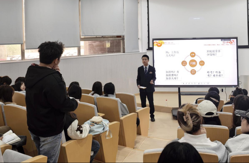 首先,徐老师代表金贸学院对郑州银行巩义支行社区市场主管柴政阳的到来表示热烈欢迎,同时表示希望能够在校企之间建立合作桥梁,共同推动学生培养;随后,柴主管围绕贷款产品政策、个人成长经历、银行平台优势、征信保护知识等方面展开讲解。通过对“郑e贷”、“郑惠贷”等特色产品的解析,帮助学生理解信贷政策与实际应用,并且结合自身从毕业生快速晋升为社区主管的成长路径,介绍郑州银行清晰的职业发展通道和薪酬福利优势。同时以“珍爱个人征信”为主题,强调信用意识在金融生活中的重要性;最后,在互动环节,同学们围绕岗位选择、备考经验、工作内容等踊跃提问,柴主管结合实际情况一一作答,现场气氛活跃。