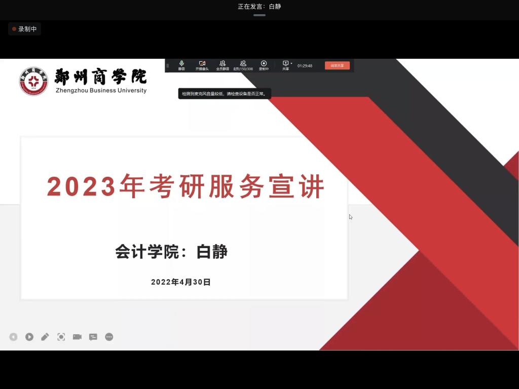 2022考研落下帷幕,为帮助2023届考研学生进行复习规划,高效备考,4月30日晚,会计学院举行2022届毕业生考研经验交流会,我院院长祝利芳、副院长刘金金、考研小组的各位教师以及2019级考研班学生参加了此次会议,会议由管理会计教研室主任武佳莉老师主持。