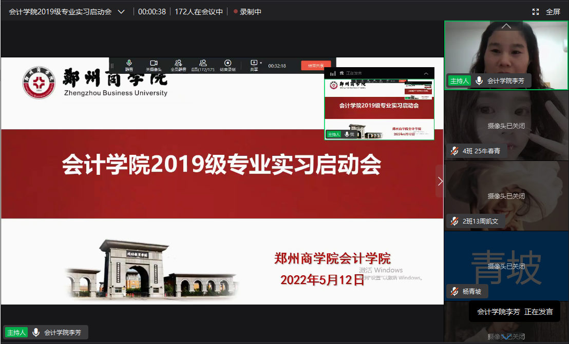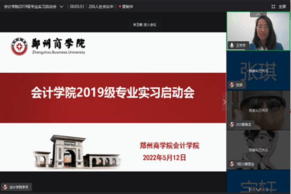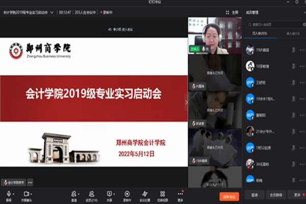 为切实做好会计学院2019级学生专业实习工作,保证VDC大数据与财务可视化平台下云实习的高效完成,5月12日,会计学院邀请跃客教育科技有限公司副总裁王芳芳、技术部经理董朝阳莅临钉钉会议,召开2019级专业实习启动会。会计学院院长祝利芳,副院长刘金金及全部实习指导教师和100余名学生参加了此次启动会,会议由我院财会实验教研室主任李芳主持。