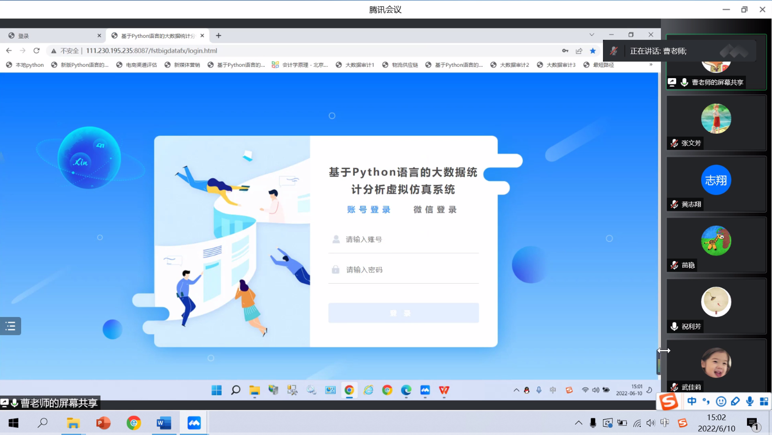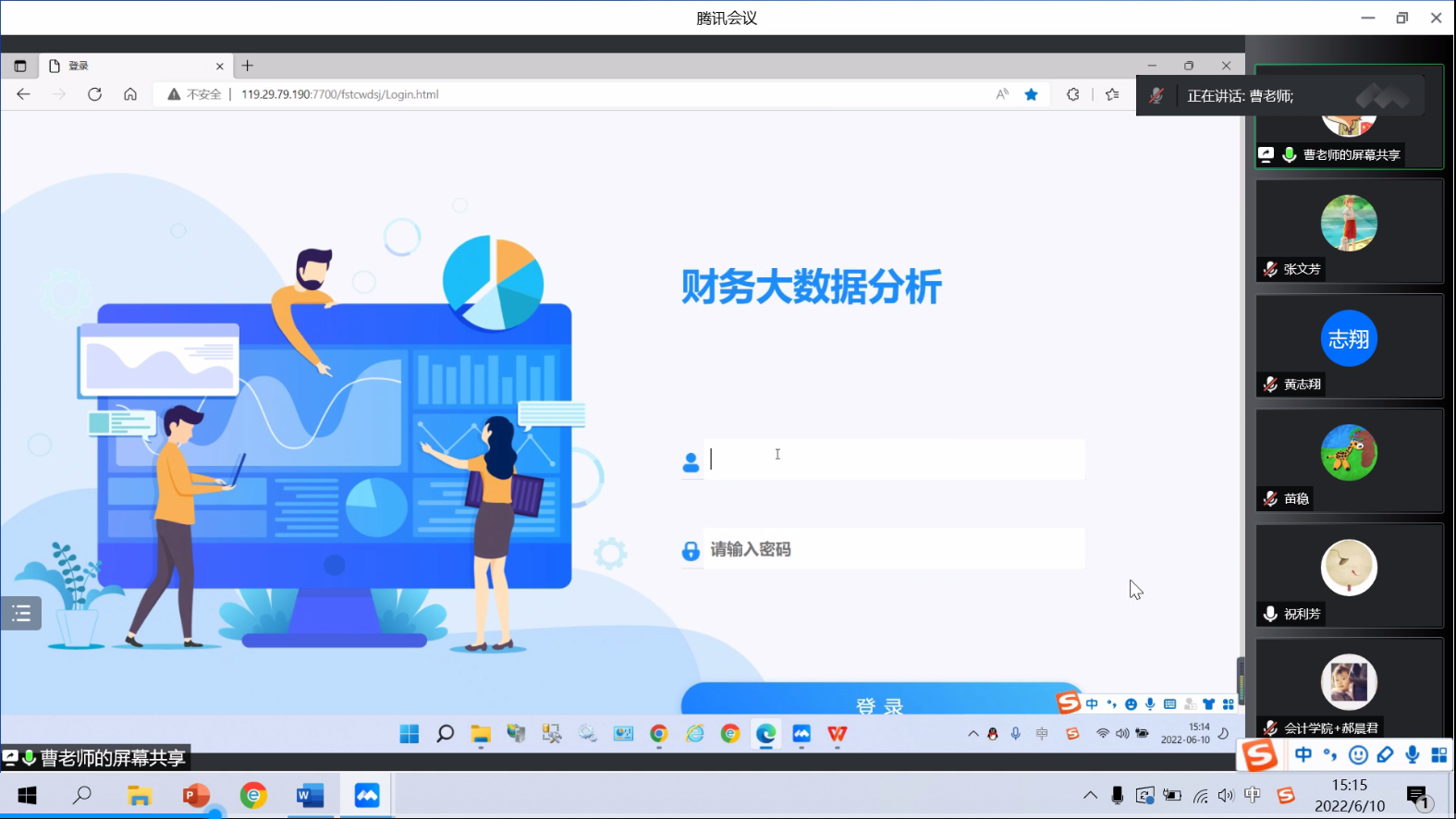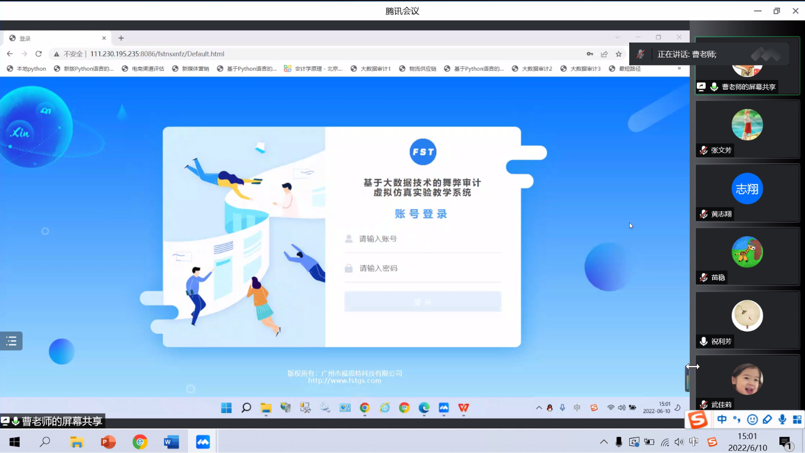 为进一步推动智能审计教学改革,适应数字经济的发展要求,使学生更好的掌握智能审计知识和应用技术,2022年6月10日,广州福思特科技有限公司(以下简称“福思特公司”)通过线上会议与pg电子官方网站会计学院深入交流了由该公司开发的大数据虚拟仿真教学平台的功能及使用方法。会计学院祝利芳院长、刘金金副院长及各教研室主任参加了此次交流会。
