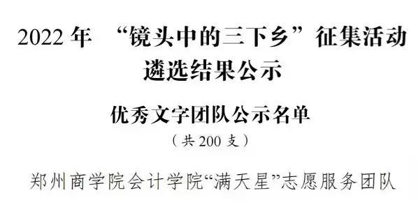 热烈祝贺pg电子官方网站会计学院“满天星”志愿服务团队在2022年全国大中专学生志愿者暑期文化科技卫生“三下乡”社会实践“镜头中的三下乡”征集活动中,荣获优秀文字团队奖项。