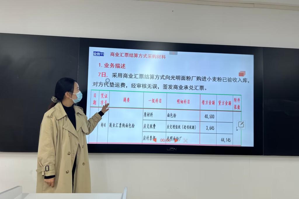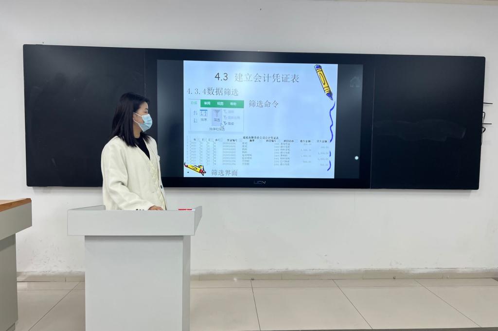 在说课现场,每位青年教师都进行了说课展示。例如,董志丹老师讲授的《Excel在财务会计中的应用》,课件制作精美简明,Excel操作流程逻辑清晰;谢盈杰老师讲授的《会计信息系统(供应链)》,教学设计环环相扣、重难点明确,说课时谢老师声音清晰洪亮,教态大方;王翠老师讲授的《当代大学生财经素养》,教学内容中融入了许多生动的案例,贴近生活,能够引起学生共鸣,激发学生兴趣,王老师教态自然、语言流畅;张玉环老师讲授的《基础会计实训》,操作性强,教学安排充实合理,能够达到良好的教学效果。各位教师在说课后进行了讨论和总结,主要围绕教姿教态、授课课件、教学重难点、课堂互动等方面进行探讨,互相指出其他青年教师授课时存在的优点及不足,并针对不足之处明确了以后改进的方向。