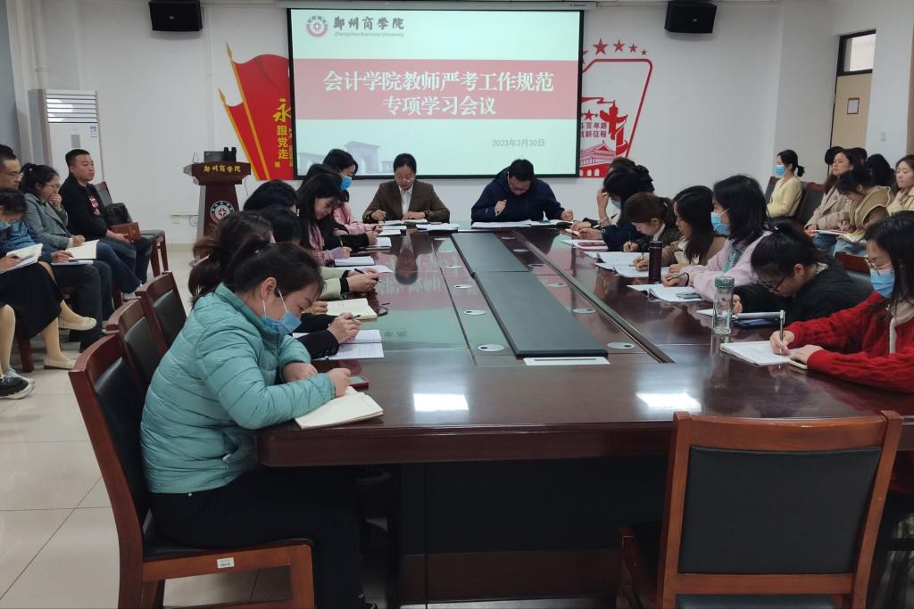 为明确教师的工作职责,规范教师工作行为,增强教师爱岗敬业、立德树人的责任感和自觉性,进一步强化pg电子官网“严教”“严考”管理,会计学院于3月30日下午在广恩楼会议室召开“会计学院教师严考工作规范专项学习会议”。参加此次会议的人员为会计学院院长祝利芳、党委书记梁鹏、副院长刘金金、全体无课教师和辅导员。