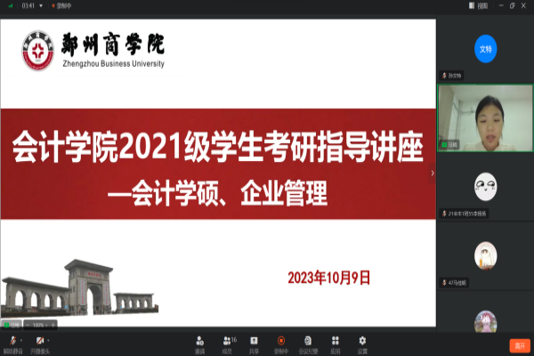 为了帮助2021级考研学子进一步了解考研流程,科学地做好备考规划,进一步明确考研目标,树立考研自信心。10月9日晚,我院邀19级优秀考研学子张志伟同学为21级学生带来考研指导讲座,会议由会计学院考研教研组教师汪艳主持,2021级有学硕考研意向的同学参加线上会议。