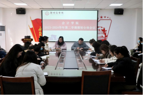 为明确本学期学院工作重点,2月26日上午,会计学院在广恩楼103会议室召开2023-2024学年第二学期期初全体会议,会计学院院长祝利芳、党委书记刘宏涛、副院长刘金金及全体教师、辅导员出席会议,会议由教学秘书耿玉伟老师主持。