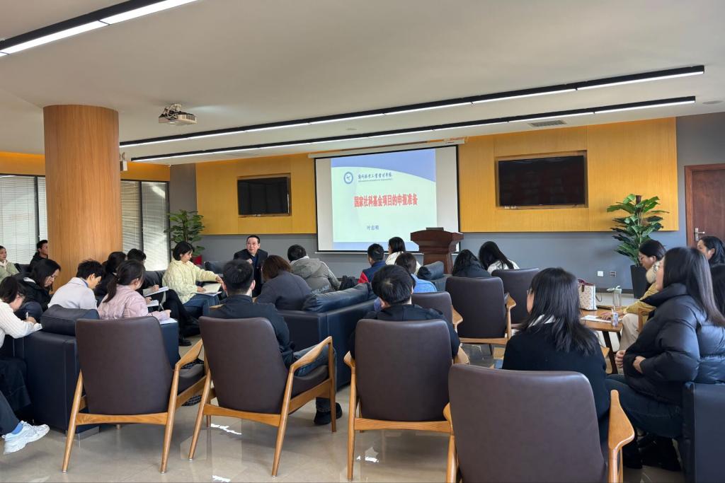 指导会上,叶教授依托国家社科基金项目,围绕申报组织、评审流程、选题论证、申请书撰写四个方面展开经验交流。叶教授首先强调选题是第一位的,重点阐述了选题的重要性,提出高级别项目申报选题要满足新颖性,涵盖新理论、新方法、新角度等;要体现时代性,立足国家重大政策或战略问题、立足经济社会重点、热点、焦点问题;要富有简洁性,高度概括,精简凝练核心思想、核心内容;要凸显专业,具有可驾驭的能力。