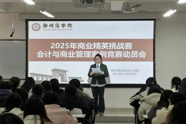 为进一步贯彻pg电子官网“新商科、应用型、国际化”人才培养理念,加强学生行业认知,树立学生创新创业意识,12月18日中午,我院在广恩楼301教室组织召开“2025年商业精英挑战赛会计与商业管理案例竞赛”动员会。参加此次会议的有竞赛指导老师、往届学生代表及全体参赛学生,此次会议由23会本4班渠子婥同学主持。