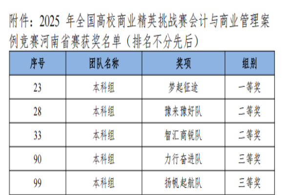 为贯彻落实学校高素质应用型人才培养目标,我院积极组织并选拔优秀学生参加2025年全国高校商业精英挑战赛会计与商业管理案例竞赛河南省赛。经过知识赛和校内赛的选拔,共遴选出6支参赛团队代表学院参加省赛。在省赛中,各团队表现出色,其中“梦起征途”荣获一等奖,“豫来豫好队”和“智汇商锐队”荣获二等奖,“力行奋进队”和“扬帆起航队”荣获三等奖。
