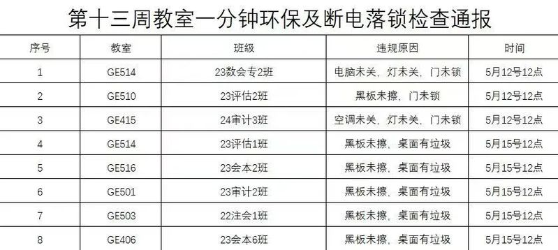 现将本周巡查结果予以公布。愿每一位同学都能将环保意识转化为持之以恒的实践,让绿色生活的理念如磐石般坚定于心,使“一分钟环保”观念似潺潺溪流,浸润生活的每一个角落。从点滴小事做起,以赤诚之心投身校园环境建设,主动参与、积极行动,携手共建整洁、温馨、舒适的求知空间,为创建美丽校园倾尽全力、贡献力量。