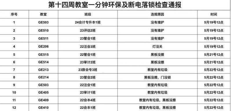 现将本周巡查结果予以公布。愿环保意识真正内化为每位学子的精神基因,让绿色生活理念如青松立岩般扎根心间,使“一分钟环保”的行动自觉如清泉流淌,浸润校园生活的每个角落。从整理讲台的细微处着手,从关闭门窗的瞬间里践行,以主人翁姿态参与校园环境共建,用双手的温度呵护求知圣地的纯净,用集体的智慧构筑诗意栖居的家园,让青春的汗水在美丽校园建设中绽放璀璨光芒。