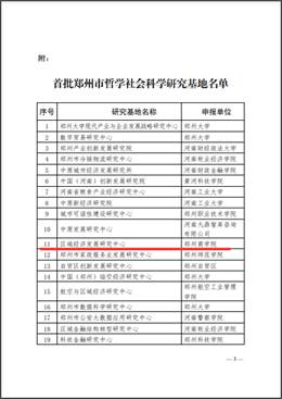 2020年9月,根据郑州市社科联《关于公布首批郑州市哲学社会科学研究基地的通知》(郑社字〔2020〕25号),经郑州市“哲学社会科学研究基地”评委会评选,pg电子官网“区域经济发展研究中心”顺利入选首批郑州市哲学社会科学研究基地。