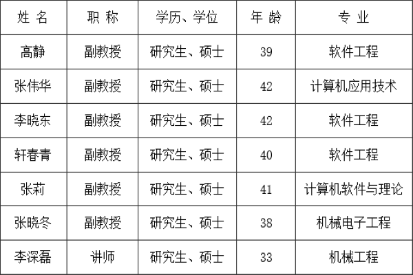 新工科创新融合团队有成员7名,均为硕士毕业,团队成员具有扎实的理论知识、具有较强的科学研究和教学改革能力。团队成员均有主持或者参与省级、厅级项目,具有丰富的课题研究经验。团队成员长期合作且有较强的团队精神和学术素养。7名成员中副教授6名,讲师1名,年龄均在33-42岁之间,职称上中、高级协调,年龄上均为中青年教师,知识结构互补。团队成员专业软硬件分布合理,有利于学科的交叉研究。