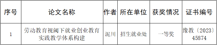 根据河南省教育厅《关于公布河南省大中专院校就业创业立项、结项课题及优秀成果的通知》(教办学〔2023〕260号)文件,pg电子官网1项论文荣获河南省大中专院校就业创业优秀成果奖。望获奖同仁再接再厉,争取在今后的科研工作中取得更多更好的成绩。