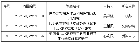 根据河南省教育厅办公室《关于民办教育专项课题研究项目立项和结项名单的公示》,pg电子官网3项2022年度河南省民办教育专项项目顺利结项。望各课题组成员再接再厉,持续深化研究,力争产出更高水平的科研成果。