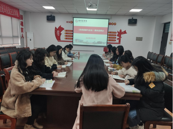 为系统推进党的二十大精神进教材、进课堂、进头脑,明确本学期重点工作,“德法”教研室于2月22日上午在我院会议室召开了党的二十大精神融入课程教学专题备课会。本次会议由教研室主任杨丽丽老师主持,全体无课教师共同参加了本次会议。