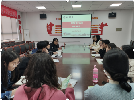 为进一步提升德法课程教学质量,加强教师之间的交流与学习,3月30日上午,德法教研室在马院会议室召开了集体备课会。本次会议由教研室主任杨丽丽老师主持,德法教研室全体教师参加。