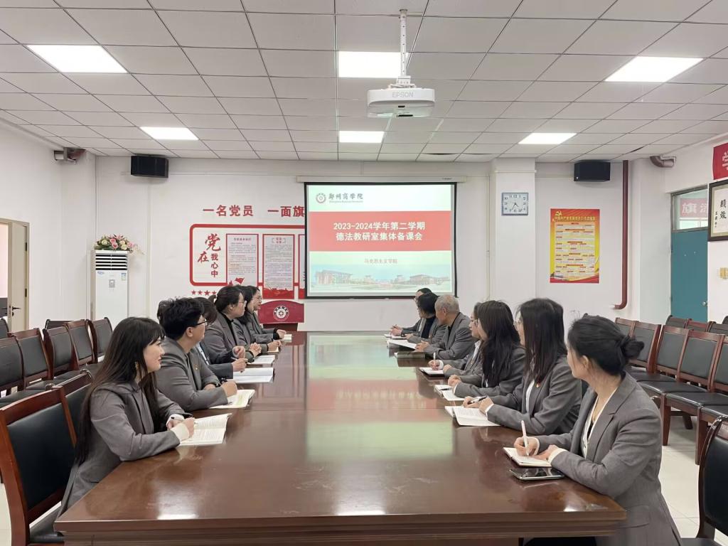 为积极准备全省高校思想政治理论课教学技能“大比武”活动,打造思政金课,凝聚集体智慧,3月26日上午,“德法”教研室在我院会议室开展集体备课会。本次会议由教研室主任杨丽丽主持,教研室全体教师参会。