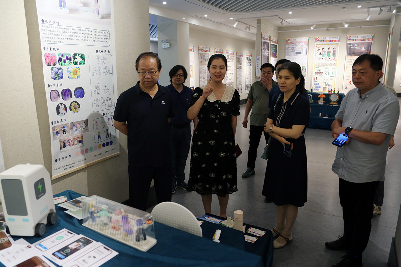 讲座结束后,常平安与郑州市美协设计艺委会副主任蒋浩、郑州市美协油画艺委会委员吕兆程一同走进我院毕业设计展现场,以“美育导师”的身份对学生作品进行细致点评。三位名家从色彩运用、主题表达、文化融合等审美维度出发,既肯定了学生作品中对传统艺术元素的创新转化,也针对作品的审美提升提出了专业建议。他们的点评不仅是对学生创作成果的认可,更是一次生动的 “现场美育教学”,让在场师生在与名家的近距离交流中,深化了对艺术审美标准的理解,激发了进一步探索艺术创作的热情。