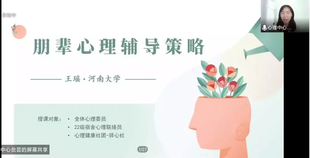 为营造你我共享、相互理解、助人自助、共同成长的心理健康氛围,更好推进心理健康教育工作开展,充分发挥心理委员及宿舍心理联络员的作用及潜能。10月26日,我院组织2022级宿舍心里联络员、心理委员观看河南大学王瑶教授题为《朋辈心理辅导的策略》的报告会。
