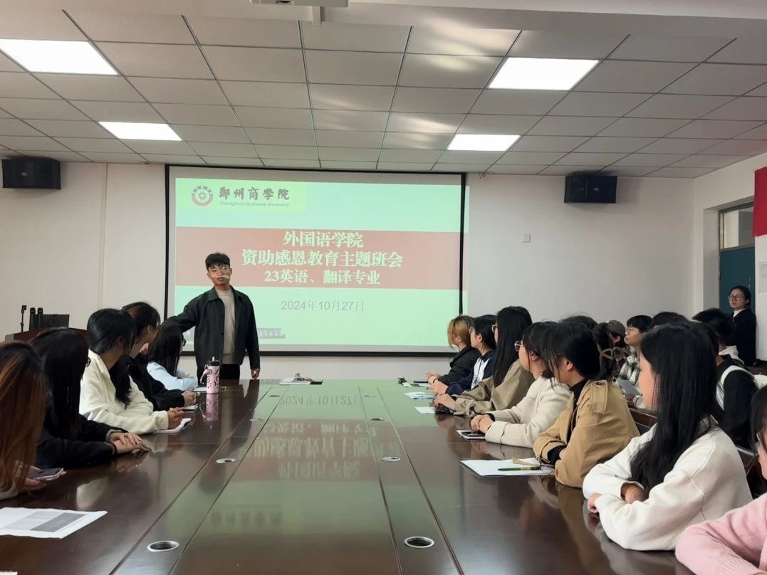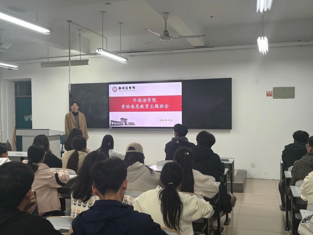 为进一步加强学生思想品德教育,弘扬优良道德风尚,引导学生知恩、感恩,并把感恩之情化为学习中自强不息、顽强拼搏的励志精神,近期,外语学院各班级围绕“资助感恩”主题开展了形式多样的主题班会活动,班会由各班辅导员主持。