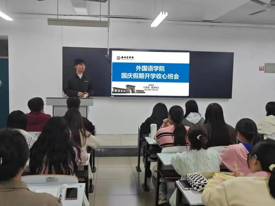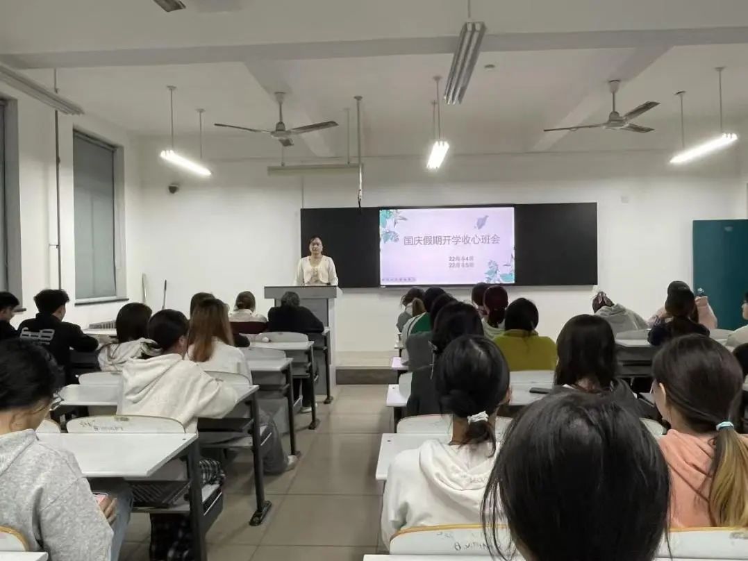为督促学生整理好身心状态,以崭新的风貌投入到接下来的学习生活中,10月7日,外语学院在外语楼组织开展国庆节后收心班会,本次班会由各班级辅导员主持。
