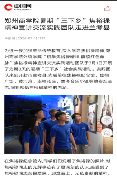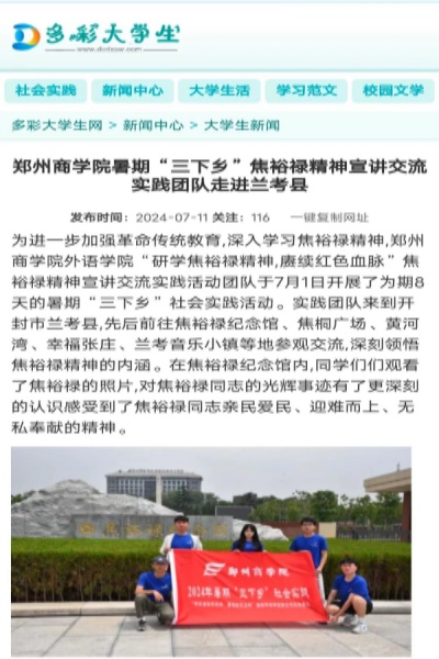 据悉,此次“研学焦裕禄精神,赓续红色血脉”焦裕禄精神宣讲活动由外语学院焦裕禄精神宣讲实践团队统筹策划,旨在传承并弘扬红色精神,从焦裕禄精神中获得心得感悟,激发奋进力量。活动过程中,我院学子研习并走访了焦裕禄纪念馆、黄河湾、幸福张庄、焦裕禄干部学院、焦桐广场和音乐小镇,在那里团队成员实地领悟到了焦裕禄精神所蕴含的艰苦奋斗、无私奉献、科学求实的精神内核,进一步认识到传承红色精神是青年无比光荣的使命。