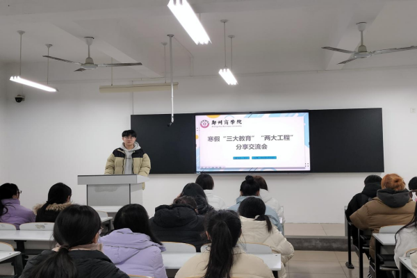在辅导员的引导下,同学们纷纷结合自身假期的家庭活动,纷纷表示:“三大教育,两大工程”活动丰富了寒假生活,使自己在养成教育中成长自我。最后,辅导员点评同学们假期的生活感悟并鼓励大家努力成为爱祖国、懂礼仪、会劳动、好读书、强体魄的郑商人。