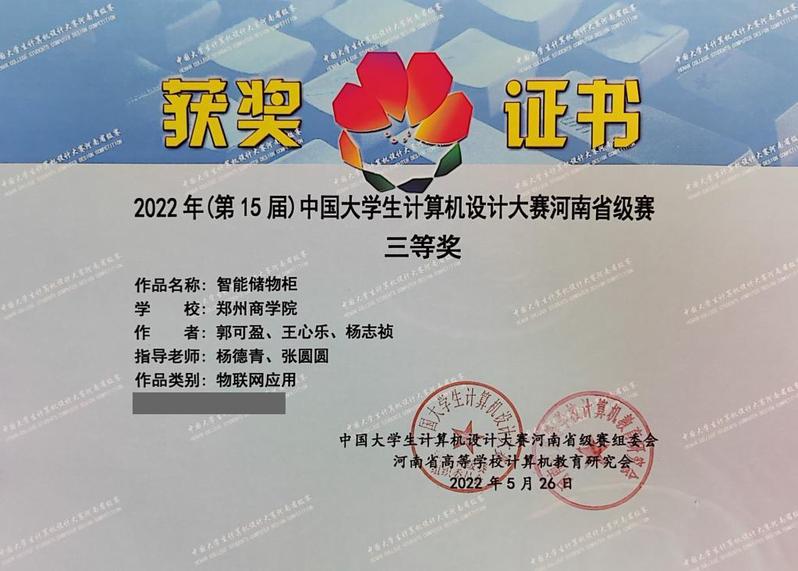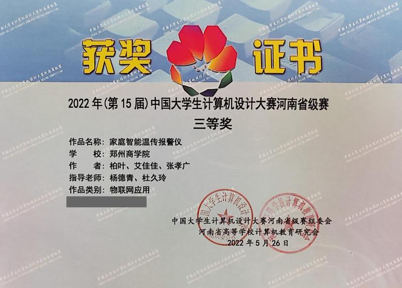 我院在张伟华院长的带领下,挑选出电子信息工程和通信工程专业的六名学生郭可盈、王心乐、杨志祯、柏叶、艾佳佳、张孝广分为两队参加该赛项中的物联网应用方向,并分别取得河南省赛三等奖的优异成绩。张圆圆、杜久玲、杨德青三位老师获得“优秀指导教师”荣誉。