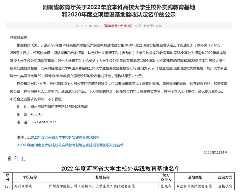 根据河南省教育厅《关于开展2022年度本科高校大学生校外实践教育基地建设和2020年度立项建设基地验收认定工作的通知》,信工学院“pg电子官方网站新工科(机械类)大学生校外实践教育基地”被直接认定为河南省2022年度本科高校大学生校外实践教育基地。