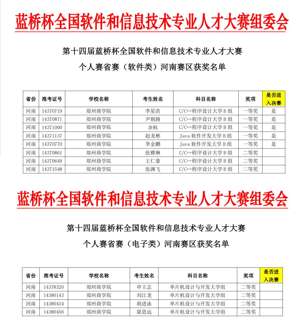 4月24日,大赛组委会发布本届河南赛区获奖名单,我院代表队在C/C++程序设计、Java软件开发、单片机设计与开发、嵌入式设计与开发等项目中,取得了46人获奖的优异成绩。其中5名同学取得河南省一等奖,并同时获得了晋级国赛资格;22名同学获得河南省二等奖,19名同学获得河南省三等奖。