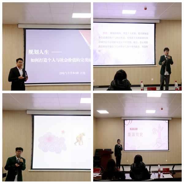会议第二项,主持人宣布本次比赛注意事项和评分规则,之后10位参赛人员通过抽签的方式先后上台作出精彩的演讲。内容紧紧围绕主题,各有特色,比赛现场气氛热烈。选手们从党的二十大精神、职场礼仪、规划人生、坚持终身学习以及正视就业挑战等五个演讲主题展开自己的演讲,以昂扬向上的姿态与铿锵有力的声音展示了自己的口才和风采。