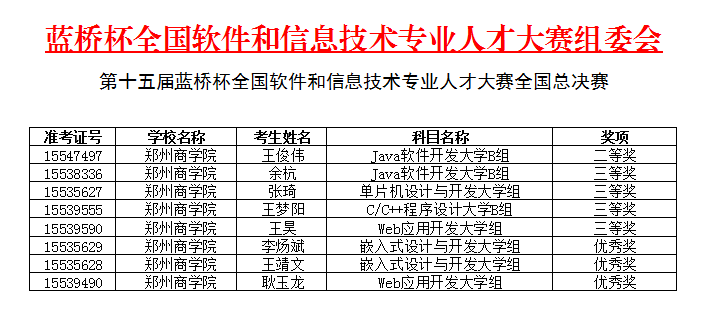 2024 年 6 月 1 日,第十五届“蓝桥杯”全国软件和信息技术专业人才大赛全国总决赛在全国 48 所高校赛点统一举行。在本届大赛中,来自北京大学、清华大学、复旦大学、上海交通大学、中国科学技术大学等 1900 余所高校,共23万名选手报名参加了省赛比拼,其中2万余名选手晋级全国总决赛。近日,总决赛成绩揭晓,我院共8名学子获得奖项,其中全国二等奖1项、三等奖4项、优秀奖3项,再创佳绩!