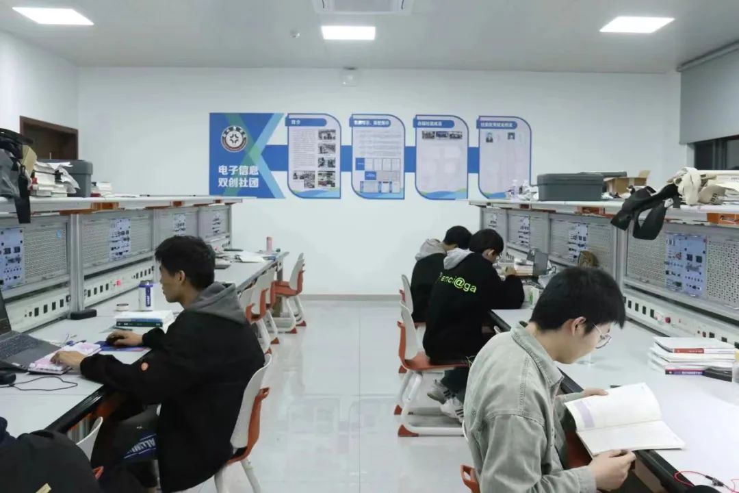 电子信息双创社团拥有干净整洁的学习环境,内部含有多种仪器仪表以满足社团成员对实践的需求。社团每年都会对有意愿加入的学生进行新生培训,在培训过程中会有专门的学长学姐进行讲解。通过选拔进入社团的学生也会持续努力前行从而提高自己的水平和能力。