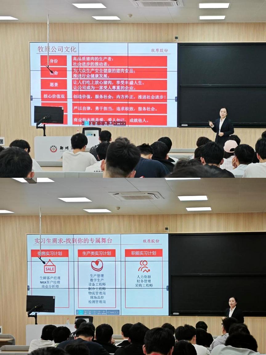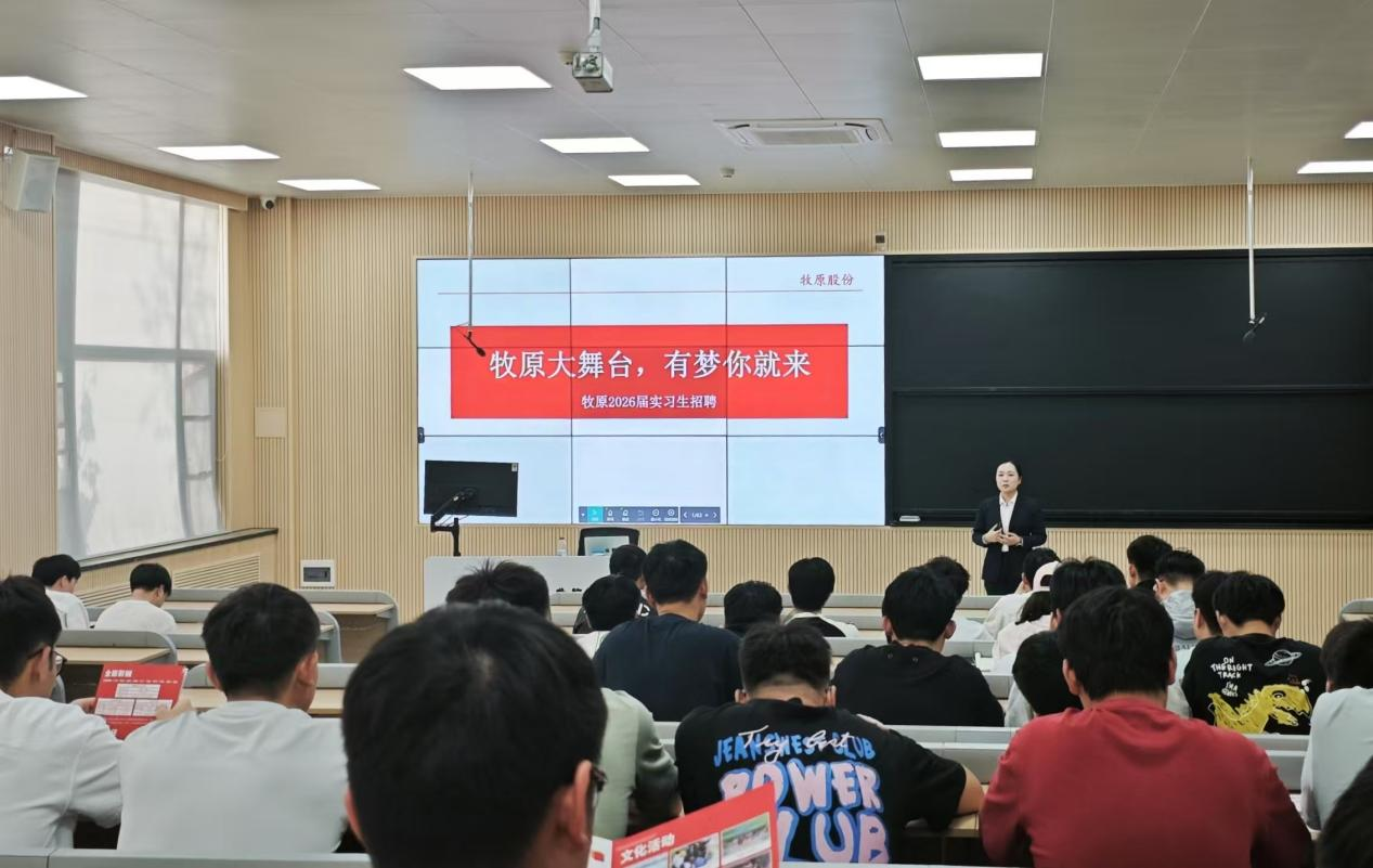 宣讲会上,詹女士首先围绕企业文化展开介绍。作为国内畜牧业龙头企业,牧原集团自创立以来始终深耕生猪养殖及产业链延伸领域。历经多年发展,现已形成集饲料生产、种猪育种、商品猪生产、屠宰加工于一体的全产业链布局,在养殖技术、智能化管理等领域处于行业领先地位。詹女士强调:"牧原的发展始终与行业趋势同频。我们不仅是'养猪人',更是农业现代化的探索者与推动者。公司为实习生提供的不仅是岗位,更是与行业共成长的广阔平台。"