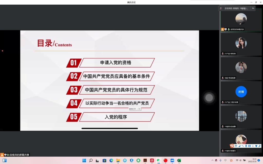 为进一步加强入党积极分子的队伍建设,更好的学习和了解党章,艺术学院党委于2022年3月31日在线上举行第34期入党积极分子第二次在线党课培训。会议由学生第三党支部书记段续洪主讲,全体入党积极分子参加线上会议开班典礼。