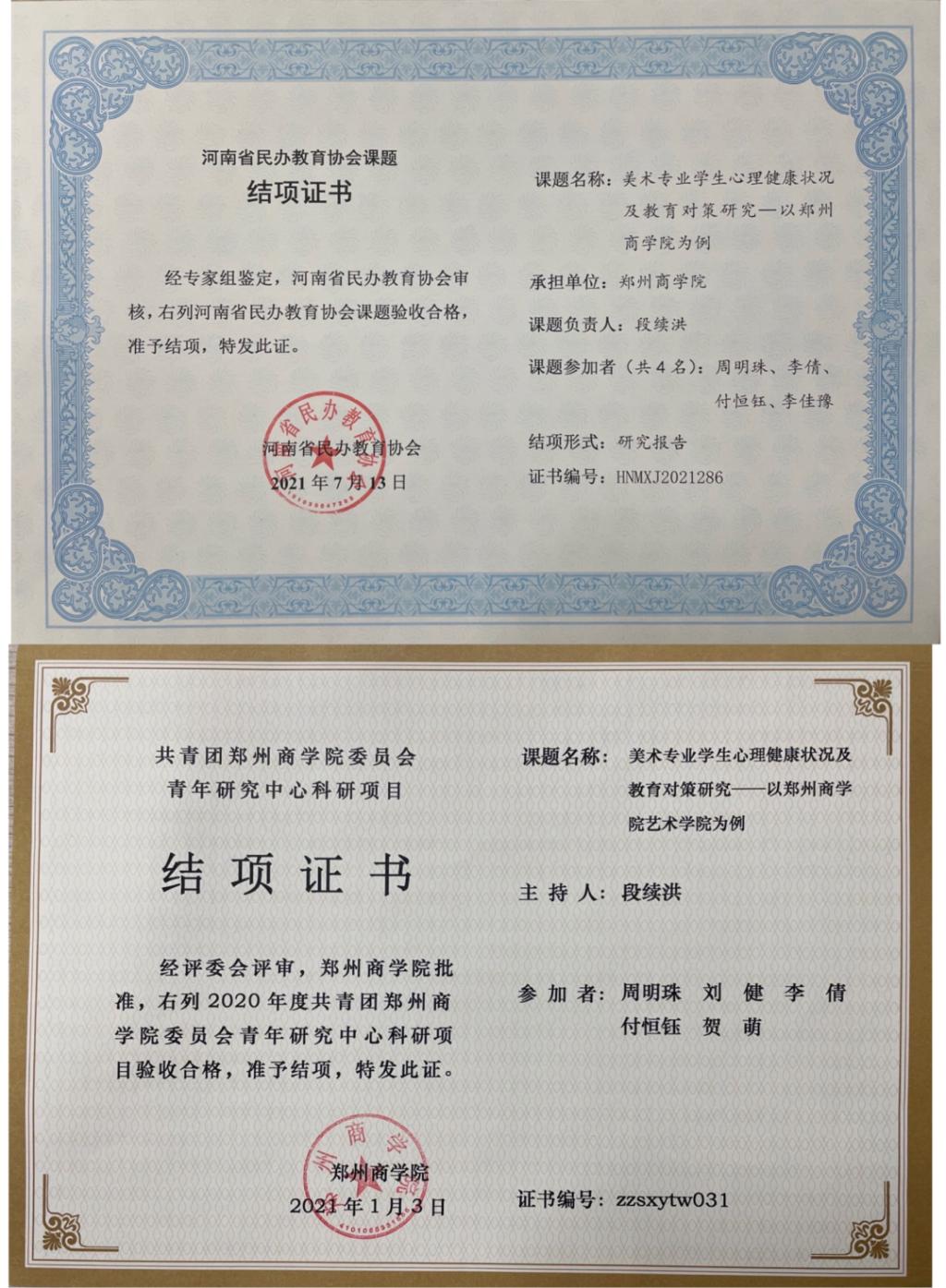 加强自身心理预防干预知识专项培训,结合学生工作实际,对学生存在的心理困扰及问题进行调研,了解学生心理健康状况,探索影响学生心理健康因素及对策,主持的两项心理健康教育科研课题已顺利结项。
