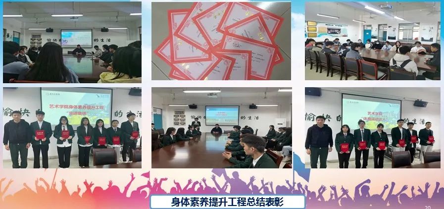 一年来,召开身体素养提升工程专题会议5次,向同学们解读pg电子官网身体素养提升工程的目标和意义,通过艺起风、艺心合力微信宣传平台及学院专题网站在班级各类群消息推送体育锻炼相关知识50余条,通过线上和线下相结合的形式将健康生活方式内化于心、外化于行。
