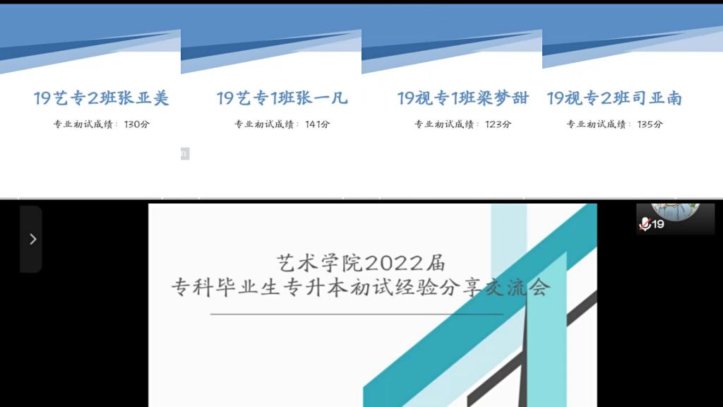 经验互分享,交流促成长。在2022届学生即将毕业之际,艺术学院组织“砥砺奋进明初心 青春使命勇担当”优秀毕业生线上主题报告会。为帮助艺术学院专科学生进一步了解专升本报考的信息政策,增强专业初试的信心,激发同学们的学习热情。5月13日晚上19:00,我院面向全体20级专科学生通过腾讯会议召开了“2022届专科毕业生专升本初试经验分享会”。