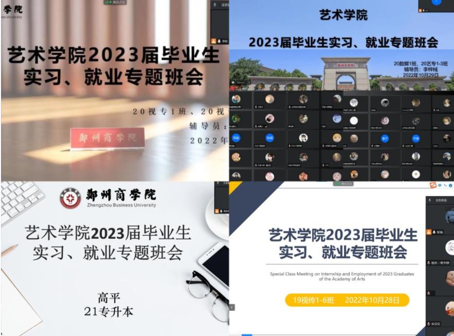 为进一步加强2023届毕业生安全教育和管理,关注和落实好学生实习实训、就业在岗情况,更好地引导学生增长才干、提升素养、锻炼技能,不断提升就业能力。10月27-10月30日,艺术学院2023届毕业班辅导员先后组织召开实习就业关爱指导、精准帮扶活动。