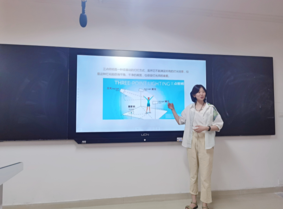 其次,动画教研室的曹婧教师讲述了拍摄动画置景与灯光,通过实物灯光现场举例,引导学生对光在环境中作用的思考,从而导入本堂的内容定格动画的置景与灯光。曹老师教学设计环节合理,语言亲切自然,有亲和力。