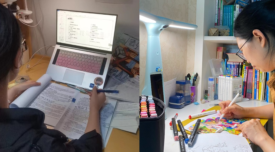 在暑期,有的学生留校复习、有的学生在家复习,留校生每天早早来到考研自习室看书、刷题,除了吃饭睡觉,所有的时间都在自习室中,考研组老师在考研自习室粘贴了多所院校考研真题,供学生参考学习,营造良好学习氛围。