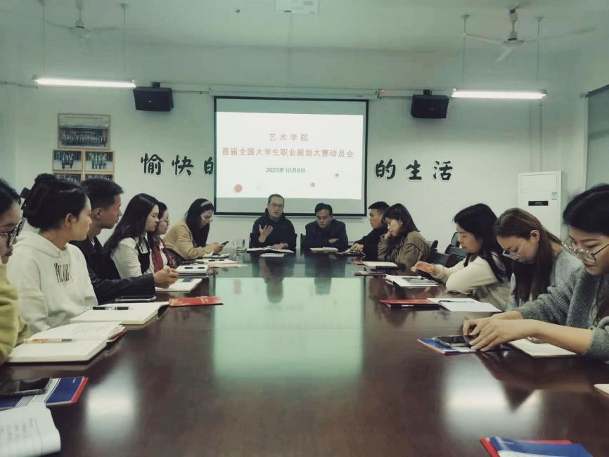 为增强大学生生涯规划意识,加强高校生涯教育和就业指导。艺术学院于2023年10月8日下午在艺术学院会议室召开了首届全国大学生职业规划大赛动员会,参加此次会议的有艺术学院党委书记李帅,团委书记殷晴波及全体辅导员老师。