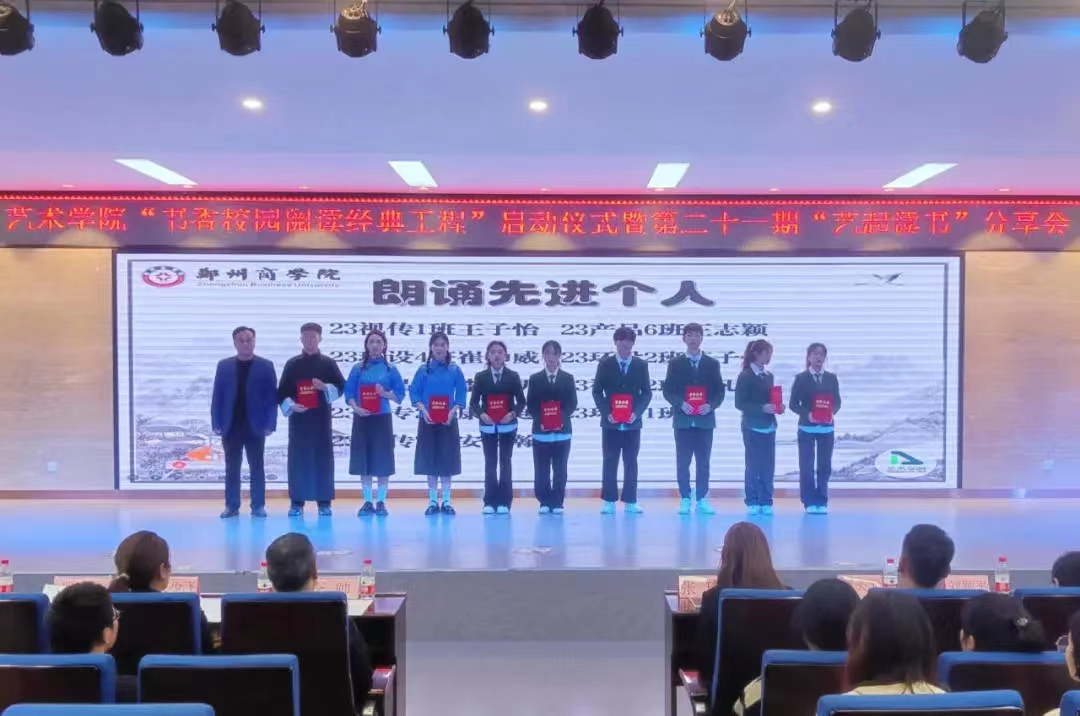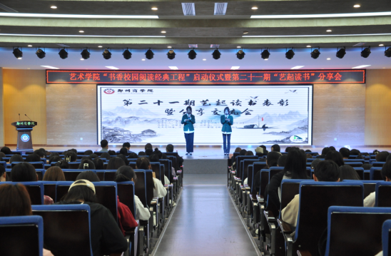 为落实pg电子官网书香校园阅读经典工程建设要求,不断形成“三全育人”良好格局,实现学生“知识、能力、人格”协调发展,传承和学习红色精神,艺术学院于10月31日晚在自力楼三楼报告厅开展2023年书香校园阅读经典工程启动仪式暨第二十一期“艺”起读书表彰分享交流会。艺术学院党委书记李帅、图书馆流动科科长朱少飞、团委书记殷晴波、全体辅导员和学生代表参与了本次活动。